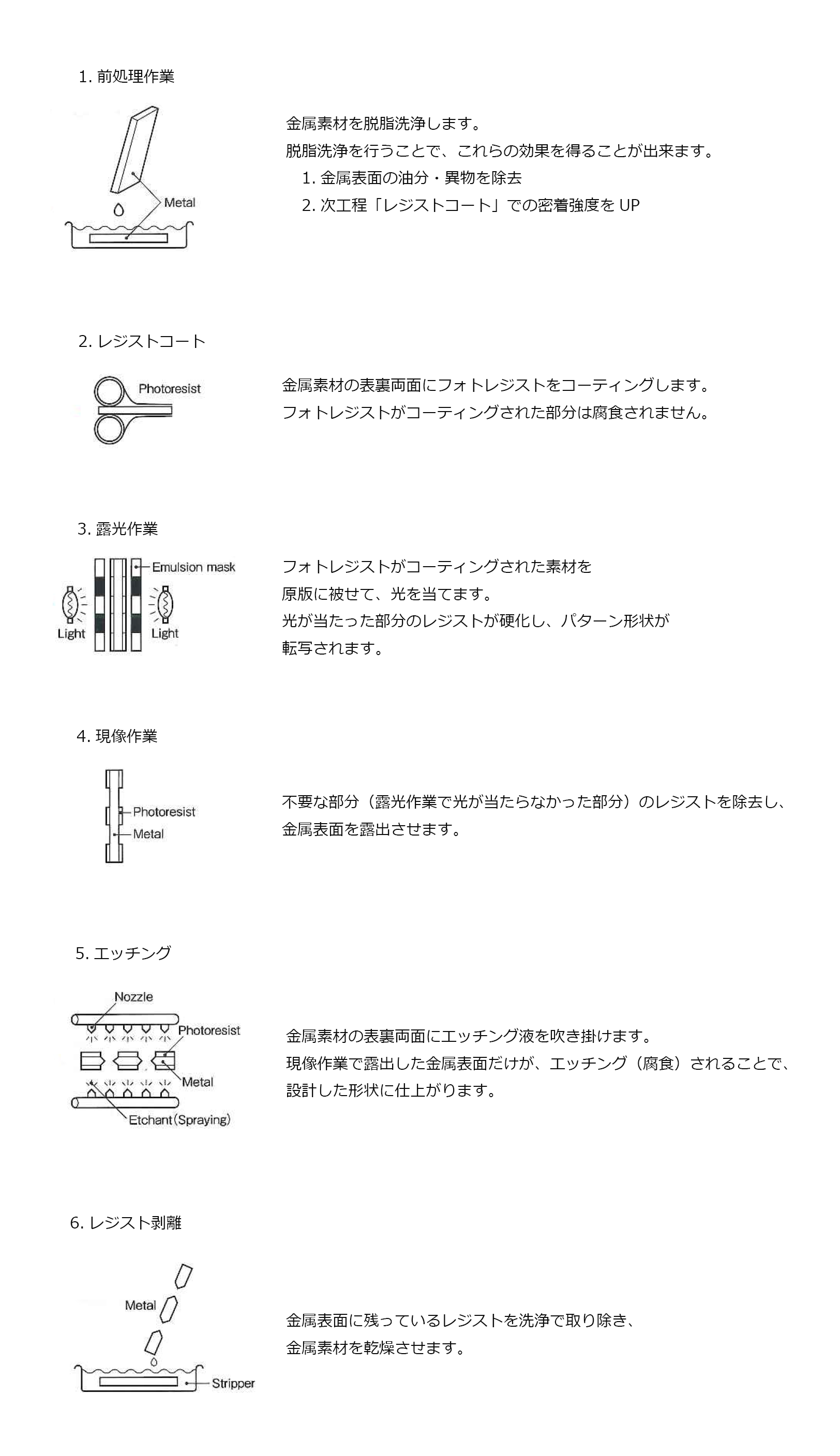 エッチング(フォトエッチング)は、金属などの素材に写真製版プロセスを用いて必要なパターンに耐食膜を形成し、